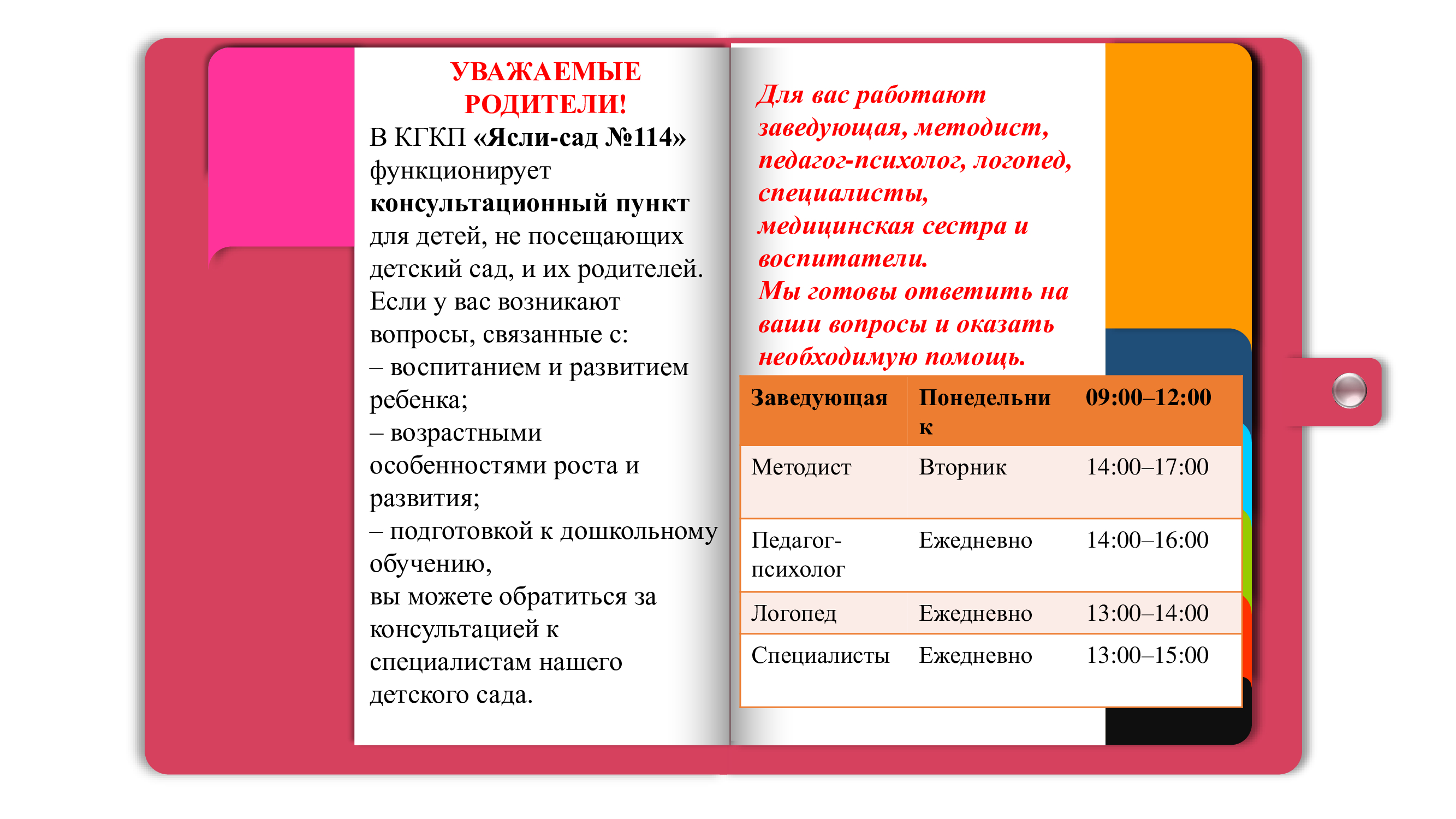 Кеңес беру пунктінің кестесі » ГККП "Ясли сад №114"